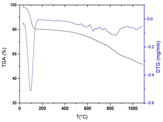 Figure 5 shows the variation in AC weight between 50 and 1100 °C using TGA. The thermogram obtained displays that a significant mass loss, equivalent to about 20%, occurred from 50 °C to 150 °C. It mainly corresponded to the removal of moisture (DTG peak at 100 °C) and, possibly, of volatile compounds that accumulated within the porous structure of the material during its storage [51]. This result is indicative of the excellent adsorption properties of AC prepared in this work. Then, the curve shows a plateau up to 450 °C with no significant mass loss, revealing high thermal resistance and possible applications in this temperature range. After this second region, a gradual weight loss of about 30% is observed from 450 °C to 1100 °C. This mass decrease is due to decomposition of the oxygenated functions and partial degradation of the carbon skeleton [52,53].