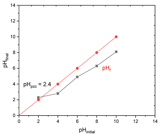 The surface charge of an adsorbent as a function of pH is an important parameter for the adsorption process, as it depends on the chemical groups present on the surface. Figure 6 presents the shift in pH AC suspension compared to the corresponding blank solutions. The intersection of curves at pH 2.4 indicates when the net AC surface charge becomes neutral at this value (pHPZC). This implies that, for pH above this, the number of negatively charged surface functions is higher than that of positively charged functions, mainly due to deprotonation of the carboxylic and phenolic groups [53].