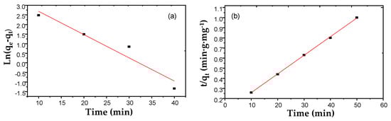 The best fitting for each of the two Equations (3) and (4) were obtained using the coefficients listed in Table 6. It was found that experimental data fitted the PSO model (Figure 7b) much better than the PFO model (Figure 7a). The quantities of dye adsorbed on AC (qexp) were almost identical to those calculated (R2 values close to unity). These results confirm the relevance of the PSO model to describe the adsorption kinetics of the AO7 dye on the AC surface and agree fully with previously reported data for the adsorption of various dyes on activated carbon [29].