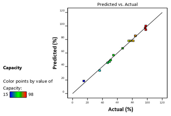 The removal efficiency predicted from Equation (11) (Y) versus the actual data (R) from Equation (2) for AO7 adsorption using AC.