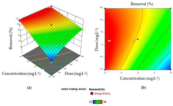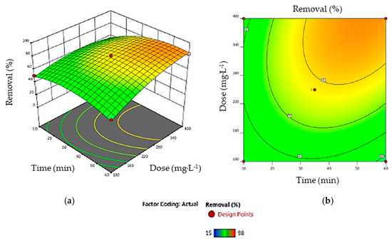 Figure 12. (a) The response surface and (b) the contour map showing the interaction of contact time and AC dosage (input parameters X1 and X3 in Equation (11), respectively) on dye removal. - Contact time and dye concentration. The 3D graph and contour map shown in Figure 13 illustrate the combined influence of dye concentration (X2) and contact time (X1) on the removal efficiency (Y). The experiment was carried out with a constant AC dosage of 0.250 mg·L−1. The contour map reveals an almost constant removal efficiency, indicating that AO7 adsorption remained relatively unchanged with the varying contact times over the range studied. This lack of significant change in removal with the contact time suggests rapid adsorption kinetics. However, increasing the dye concentration and maintaining a constant contact time leads to local saturation of the most easily accessible active sites. This phenomenon causes the driving force to remain at the same level until the adsorption process reaches equilibrium [59]. In general, the interaction of the dye concentration and time of contact has a negative effect on the response variable.