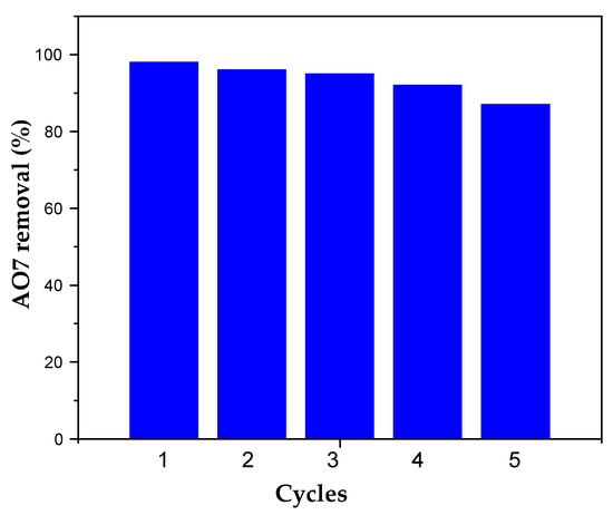To test the reusability of AC after dye removal, desorption experiments were carried out with 50 wt.% ethanol at room temperature for 2 h. The adsorbent obtained was then recycled four times to remove AO7 (Figure 14).