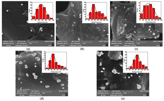 To analyze the morphology of AuNPs/PC nanocomposites prepared by different Au3+ concentrations, SEM images were obtained. Figure 2a–e show the SEM images of Au NPs/PC nanocomposites prepared with Au3+ concentrations from 0.01 mmol to 0.12 mmol. The generated gold nanoparticles are well adsorbed on the surface of porous carbon materials. As the Au3+ concentration increased, the size of the Au NPs became larger and the concentration of gold nanoparticles increased. The upper right corner of Figure 2a–e shows the size distribution of the generated Au nanoparticles. The size of the generated Au nanoparticles is distributed between 0 nm and 140 nm. It is the uneven distribution of Au3+ in the dispersion during the reaction which leads to the rapid reduction of some Au3+ to cluster into small particles, while the remainder is attached to the original Au nucleus after reduction to continue to grow and increase in size [22].