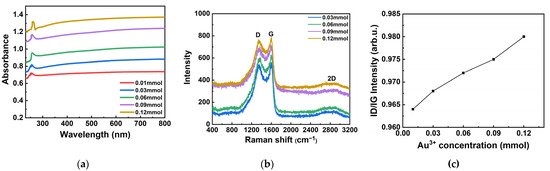 Figure 3a shows the UV–visible absorption spectrum of Au NPs/PC composites prepared with different Au3+ concentrations. The strong absorption band of Au nanoparticles is assigned to the π-π* transition of the porous carbon material ligand. The absorption bands of samples are located in the ultraviolet region, indicating that the composites have good light absorption in the visible region (400 nm–700 nm) [23]. The obvious absorption peak, which corresponds to the original absorption peak of porous carbon materials, indicating that porous carbon materials have a strong absorption of light in the range of 255 nm–280 nm. With the increase in Au3+ concentration, the absorption peak has a very small red shift, indicating that the interaction between Au nanoparticles and porous carbon materials enhances the absorption effect of porous carbon materials. However, it increased steadily in the range of 500 nm–600 nm and did not show any absorption peak. It indicated that the surface plasmon absorption of the generated Au NPs was weak, which was caused by the attenuation of the protective agent. This situation has been reported in the relevant literature [24]. According to the Raman spectrum of the Au NPs/PC nanocomposites (Figure 3b), there are two obvious peaks: one near 1350 cm−1 corresponding to the D band which is attributed to disorder or defects in the carbon atoms band and 1600 cm−1 corresponding to the G band which is attributed to the sp2 in-plane vibration of carbon atoms [25,26,27], respectively. The intensity ratio of these peaks (ID/IG) determines the degree of graphitization in carbon materials [28,29,30]. As shown in Figure 3c, the ID/IG values of the Au NPs/PC nanocomposites (0.964–0.981) by the reduced method with different Au3+ concentrations were obtained in this work, which are significantly higher than the porous carbon (0.85). In addition, the layered graphene structure in porous carbon can be demonstrated by the characteristic 2D band near 2800 cm−1, which can promote the transfer of ions to reduce resistance.