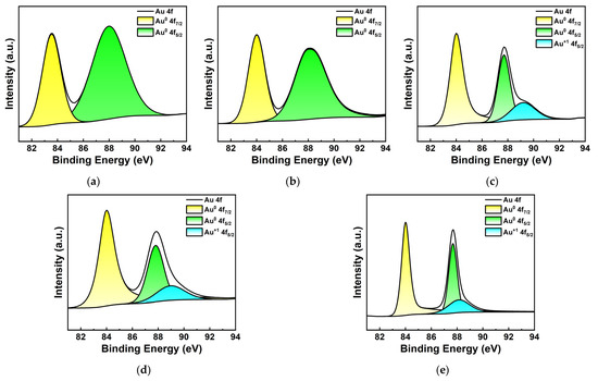 Figure 5 shows the Au 4f high-resolution XPS spectrum of Au NPs/PC nanocomposites prepared with different Au3+ concentrations. As shown in Figure 5a,b, when the concentrations of Au3+ are lower, the two absorption peaks is centered at 84 eV and 88 eV corresponding to the binding energies of Au0 4f7/2 and Au0 4f5/2 of Au, respectively. As shown in Figure 5c,d, with the increase in Au3+ concentration, Au 4f7/2 and Au 4f5/2 dissociate into two smaller absorption peaks at 83.8 eV, 87.69 eV and 89.16 eV, corresponding to the oxidation states of Au0 4f7/2, Au0 4f5/2 and Au+1 4f5/2 [32,33], respectively, which were due to the incomplete reduction of the precursor [34]. In fact, the generated Au nanoparticles show high surface energy, which is another major factor in the presence of gold oxide particles. In general, the difference between the position of the characteristic peak corresponding to Au0 and Au3+ in the Au 4f XPS spectrum does not exceed 1 eV, which is difficult to distinguish in the spectrum.