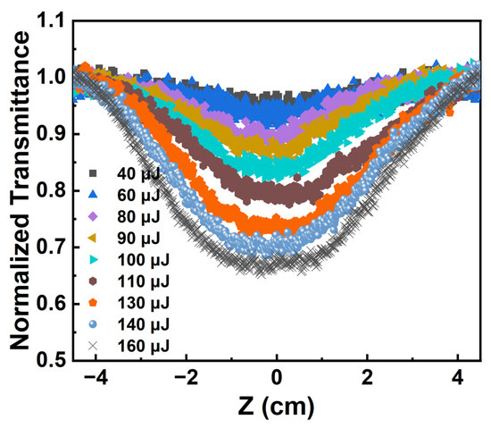 where is the transmittance of the Au NPs/PC nanocomposites at different positions and is the linear transmittance, which is the sample far away from the focus position. At 532 nm, the pulse energy changed from 40 μJ to 160 μJ; the normalized transmittance curves of Au NPs/PC nanocomposites dispersion are given in Figure 6.