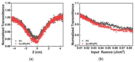 When the sample is far away from the focus, the normalized transmittance of Au NPs/PC nanocomposites is equal to one, corresponding to the linear transmission state. As the sample is close to the focus, the normalized transmittance of the Au NPs/PC nanocomposites decreases rapidly, and the aperture of the normalized transmittance curve of the Au NPs/PC nanocomposites is larger.