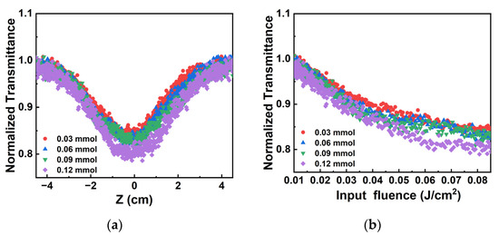 In order to study the OL response of different concentrations of Au3+, the Au3+ concentration was changed to 0.03 mmol, 0.06 mmol, 0.09 mmol and 0.12 mmol. The pulse energy is 100 μJ at 532 nm. As shown in Figure 8a, the opening of the normalized transmittance curve of the Au NPs/PC nanocomposites become larger and the normalized transmittance at the focus position is lower with the higher concentration of Au3+. Figure 8b shows the normalized nonlinear transmittance curve in the different incident pulse energy density of Au NPs/PC nanocomposites. With the increase of Au3+, the normalized transmittance curve of Au NPs/PC dispersions became lower. Therefore, with the increase in Au3+ concentration, the curve of Au NPs/PC nanocomposites shows wider opening and lower transmittance (z = 0). It means that the interaction between large-sized gold nanoparticles and porous carbon show the better OL effect.