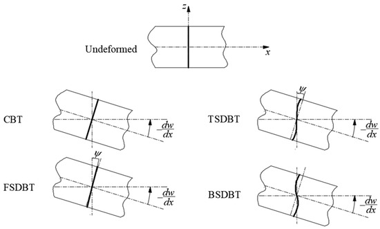 In the present study, four beam theories, namely the CBT, FSDBT, TSDBT, and BSDBT, which are most often used in existing studies, are examined for buckling and free vibration analysis of FGP beams. Since different deformation assumptions are applied, the displacement fields of those beam theories differ from each other, as shown in Figure 2.