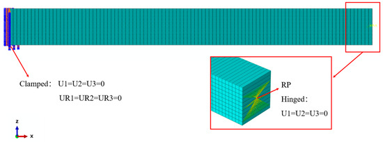 FE simulation is a well-accepted tool for structural analysis, and the simulation results are used in this paper for direct comparison with those of different beam theories. To begin with, the FE model of the FG porous beam is created in the commercial software ABAQUS 2016 and meshed with eight-node reduced integration hexahedral elements (C3D8R) of controlled size, as shown in Figure 3. Due to the graded distribution of porosity, the material properties of the FG porous beam change continuously along the thickness direction, which is difficult to implement in the software. As an alternative, the continuous variation in material properties is approximated in a stepwise manner. To this end, the FG porous beam model is divided into a number of layers of equal thickness via the “offset faces” option, and the material properties are constant in each individual layer but change from layer to layer across the thickness. For the buckling analysis, an axial compressive load is applied at the reference point (RP) that couples with the right end of the beam. The step procedure named “Linear perturbation/Buckle” is selected to obtain the critical buckling load. For the free vibration analysis, the “Linear perturbation/Frequency” procedure is used to determine the natural frequency. Various numbers of layers were examined and it is established that a total number of 40 layers will suffice in simulating the FGP beam with continuous material distributions and furnishing converged simulation results.