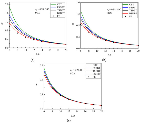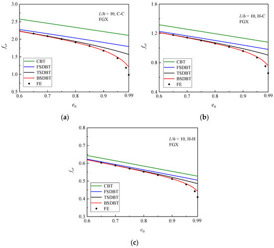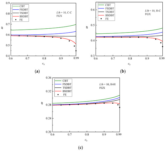 and compared in Figure 5, where results for e0 = 0 are also provided as a reference. It is concluded from the figure that for the homogeneous beam (e0 = 0), all the shear deformation beam theories provide very close predictions to the simulation results. However, for the high porosity values (e0 ≥ 0.9), the difference between the results of theories and simulations significantly increases, and this effect turns out to be less noticeable for the soft (hinged) end supports. It should be noted that when the porosity coefficient e0 is increased to 0.98, only the BSDBT gives close predictions to the simulation results, with a difference less than 10%. Unfortunately, when e0 = 0.99, the differences go up to 22.8% and 15.4% for the C-C and H-C end supports, respectively.