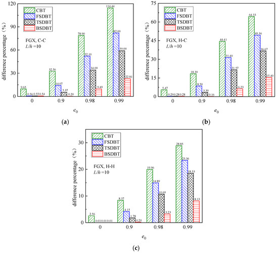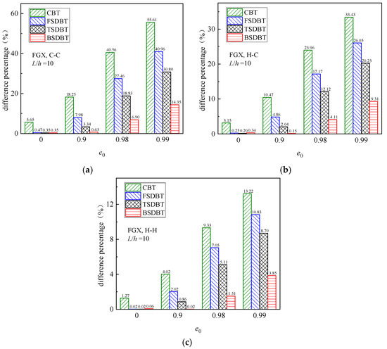 To further illustrate the influence of the porosity coefficient, Figure 8 depicts the fundamental frequency versus porosity coefficient curves of FGX porous beams with different boundary conditions. According to the CBT, FSDBT, and TSDBT curves, the fundamental frequency slightly increases as the porosity coefficient rises. However, both the BSDBT and simulation results show that the frequency decreases with the porosity coefficient increasing, and this effect becomes much more noticeable when the porosity value e0 increases from 0.9 to 0.99. The figure also shows that all the shear deformation theories give very close predictions to simulation results when e0 < 0.9, but there are distinct differences between the results obtained from the theories and simulation when e0 > 0.9. The differences at high porosity values (e0 = 0.9, 0.98, and 0.99) are calculated and compared in Figure 9. Again, the difference is observably elevated when the porosity coefficient is increased to 0.99 and the end supports become more rigid. Nonetheless, the BSDBT always provides the closest predictions to simulation results, with the maximum differences of 6.90% and 14.35% at e0 = 0.98 and 0.99, respectively.