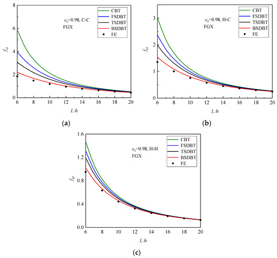Figure 10 shows the variation in the fundamental frequency with the slenderness ratio for the FGX porous beams with different boundary conditions. As observed in the buckling analysis, a higher slenderness ratio leads to a lower stiffness and thus results in smaller fundamental frequency and difference between the theories and simulation. For a better illustration, the differences between the results of various theories and simulation at L/h = 6, 10, and 20 are computed and compared in Figure 11. It is seen that for a thick FGX porous beam (L/h = 6), only the BSDBT furnishes reasonable predictions with the differences of 13.9%, 8.8%, and 3.32% for the C-C, H-C, and H-H end supports, respectively. As the slenderness ratio is increased to 20, all the shear deformation theories give close predictions with the maximum difference of 8.60%. It is also found that for the same beam, the difference of the frequency results is smaller than that of buckling results.