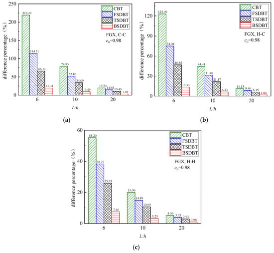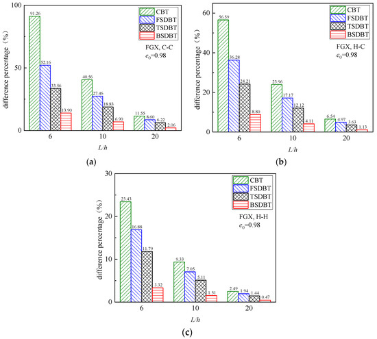 Figure 6 displays the variation in critical buckling load with the slenderness ratio for the FGX porous beams with different boundary conditions. The critical buckling load and the difference between those beam theories declines as the slenderness ratio increases because a higher slenderness ratio leads to a lower stiffness and a weaker transverse shear effect. The differences between the results of various theories and the simulation at L/h = 6, 10, and 20 are further plotted and compared in Figure 7. It is seen that only the BSDBT provides very close predictions to the simulation ones with differences less than 10% when the slenderness ratio is increased to 10. The differences are further reduced to 3.02%, 1.84%, and 0.98% for the C-C, H-C, and H-H end supports in order when L/h = 20.