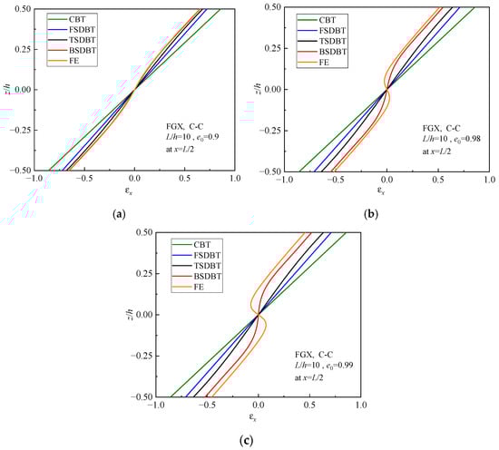 Normal strain distributions in the cross-section of FGX porous beams: (a) e0 = 0.9; (b) e0 = 0.98; (c) e0 = 0.99.