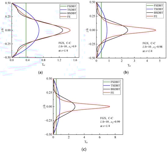 Shear strain distributions in the cross-section of FGX porous beams: (a) e0 = 0.9; (b) e0 = 0.98; (c) e0 = 0.99.