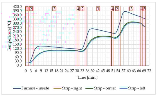 Figure 3, it can be seen that the entire run of one of the measurements took 69 min, with the most time-consuming of the individual sections being the sections marked with the number 3, which shows the heat transfer inside the furnace. At the beginning of these sections, there is a significant temperature difference between the thermocouple measuring the temperature inside the furnace and the thermocouples measuring the temperature on the surface of the steel strip. The difference in these temperatures gradually decreases, but by the end of