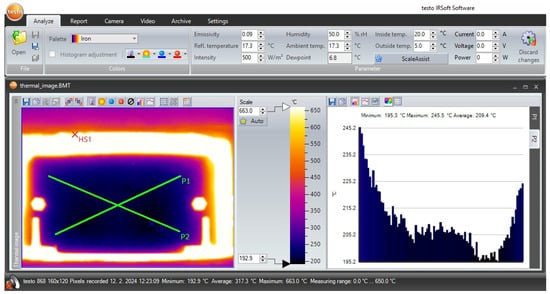 40]. Since the adjustment of the emissivity to the thermal imaging camera in the real-time measurement was time-consuming, the last part of the measurement methodology was modified. During the experimental measurements, thermal images were taken of the steel strip and the emissivity determination was performed when these thermal images were processed using the software. In this way, the emissivity value for each type of steel strip was determined. This was followed by data processing and evaluation.