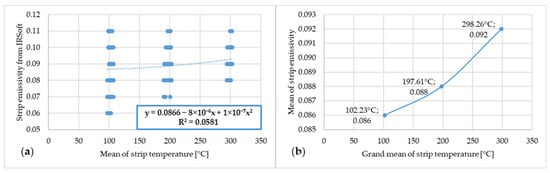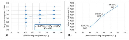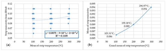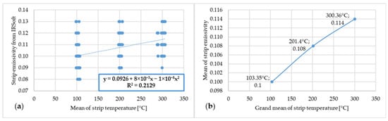 (a) Dependence of emissivity values from IRSoft software and mean temperature of steel strip 1; (b) dependence of mean emissivity value and grand mean temperature of steel strip 1.
