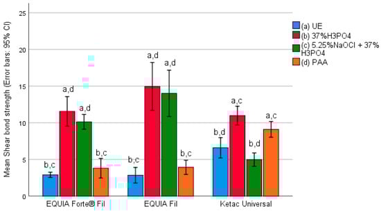 Among the thermo-cured glass–ionomer cements, the lowest adhesion strength was observed in samples without enamel treatment, except for Ketac Universal. The adhesion strength of untreated enamel samples of thermos-cured Ketac Universal was also higher than that of the other two materials. Conversely, the highest adhesion strength was observed in the case of thermo-cured EQUIA Forte® Fil material.