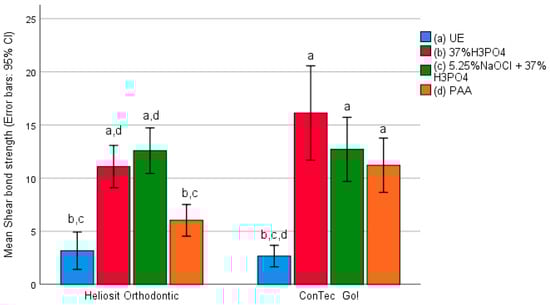 An adhesion, or SBS, of 5.9–7.8 MPa represents the reference value for adhesion in orthodontics. An SBS of 5.9–7.8 MPa has become the standard for adhesion in orthodontics since Reynolds introduced it in 1975 [32,33,34,35]. This value is clinically significant because the likelihood of damaging dental tissue increases by 1.3 times for each additional MPa of SBS [36].