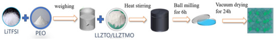 According to the molar ratio of Li+/EO (ethylene oxide) = 1/20, a proper amount of lithium salt (LiTFSI) was added into the PEO-containing beaker, followed by anhydrous acetonitrile, and stirring took place at 60 °C for 8 h. Then, LLZTMO was added into the beaker in a weight ratio of LLZTMO/PEO = 1/1, and milling continued for 6 h. After that, the resulting slurry was poured into a glass petri-dish mold, and after drying at 60 °C for 24 h, a uniformly dispersed and flat LLZTMO–PEO composite electrolyte was therefore gained. The preparation process is indicated in Figure 1. The preparation of the LLZTO–PEO composite electrolyte completely refers to the LLZTMO–PEO electrolyte but without adding a MoO3 precursor.