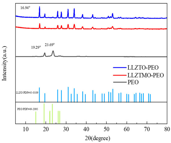 The XRD pattern of the composite solid electrolyte and PEO is shown in Figure 3. PEO shows the characteristic peaks appearing at 19.29° and 23.69°, which are very consistent with the previous reports [45] and the stand card PDF#49-2095. It can be seen that the positions of the diffraction peaks and the relative intensity of each peak of LLZTO and LLZTMO are highly accordant with that of the garnet-type Li5La3Nb2O12 (standard card PDF#45-0109). There are no other miscellaneous phases found, indicating that the synthesized LLZTO/LLZTMO is a cubic-phase garnet-type structure. The positions of the diffraction peaks at 16.84°, 25.84°, 27.66°, 31.00°, 34.05°, 38.21°, 43.23°, and 53.13° correspond to (211), (101), (400), (420), (422), (501), (611), and (642) crystal faces [46]. The composite electrolytes show full XRD peaks of both garnet and PEO components, which means that the presence of LLZTO/LLZTMO does not affect the crystallization of PEO. But, if carefully comparing, one would find that the XRD line of PEO at 23.69° shifts to a higher degree, which may be due to the presence of LLZTO/LLZTMO increasing the stress of PEO or reducing the layer spacing of PEO.