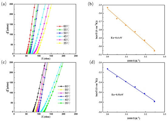 (a) LLZTMO–PEO variable temperature impedance; (b) LLZTMO–PEO corresponds to the activation energy; (c) LLZTO–PEO variable temperature impedance; (d) LLZTO–PEO corresponds to the activation energy.