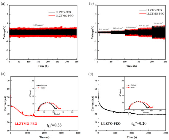 (a) Symmetrical battery constant current charge and discharge cycle; (b) Multiplier test curve for symmetrical batteries line; (c) i-t polarization curve of LLZTMO–PEO electrolyte and the symmetric battery impedance before and after polarization; (d) i-t polarization curve of LLZTO–PEO electrolyte and the symmetric battery impedance before and after polarization.