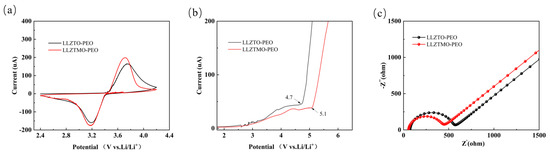 Figure 7a shows the CV curves of LLZTO/LLZTMO–PEO-based batteries in the voltage range from 2.4 V to 4.2 V, with a scanning rate of 0.1 mV s−1. Both cells show significant reduction peaks at ~3.2 V and strong oxidation peaks at ~3.8 V, corresponding to the lithium plating and stripping processes of lithium ions. With careful observation, one may find that the CV curve of LLZTMO–PEO has large REDOX peak areas, indicating that it has a large specific capacity. According to Figure 7b, we can observe that under the test environment of 60 °C, the SS/LLZTO–PEO/Li cell begins to show a significant increase in current at 4.7 V, which marks the beginning of electrolyte decomposition. As the voltage continues to rise during the test, the current released by the decomposition reaction continues to increase. For the LLZTMO–PEO composite electrolyte, the initial voltage of oxidation decomposition is increased to 5.1 V. This change may be due to the interaction between LLZTMO and the polymer matrix interface, resulting in a change in the electronic energy level of PEO, thereby improving the antioxidant stability of PEO. To explore the charge transfer impedance of the battery, EIS measurements were performed on the half battery, as shown in Figure 7c. Each EIS curve consists of a semicircle caused by charge transfer resistance (Rct) [47] and a diagonal line corresponding to lithium-ion diffusion. It can be seen that the charge transfer impedance of LLZTO–PEO is 505.09 Ω, and the interface charge transfer impedance of LLZTMO–PEO is 397.13 Ω [48].