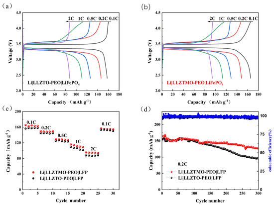 The rate performance of the full cell at different current densities from 0.1 to 2C at room temperature 25 °C is shown in Figure 8c. At a 0.1C current density, the specific discharge capacities of the assembled batteries are 156.4 mAh g−1 and 165.4 mAh g−1 for LLZTO and LLZTMO electrolytes, respectively. After cycling 0.2, 0.5, 1.0, and 2C cycles and recovery to 0.1C, the specific discharge capacity of the battery recovered to 150.4 mAh g−1 and 156.7 mAh g−1, respectively, indicating that the battery assembled by the composite solid electrolyte has good reversible performance. The cycling stability test is shown in Figure 8d at 0.2C. It can be seen that the initial specific discharge capacities of LLZTO–PEO and LLZTMO–PEO are 145.6 and 157.5 mAh g−1, respectively. After 300 cycles, the specific discharge capacities are 102.6 and 127.0 mAh g−1, and the capacity retention rates are 70.5 and 80.6%, respectively. The results show that LLZTMO–PEO cells have a higher specific discharge capacity, which is due to the fact that Mo ion doping accelerates the relative motion of lithium ions and promotes the migration of lithium ions. In conclusion, the electrochemical test results indicated that the cell with LLZTMO–PEO composite solid-state electrolyte exhibited better rate performance, high reversible capacity, and a good cycle life, compared with the LLZTO–PEO electrolyte.