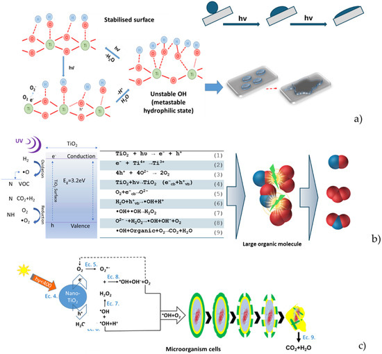 Schematic representation of the self-cleaning mechanism of the surface due to the activation of TiO2 nanoparticles under UV irradiation. (a) Increase in hydrophilicity (authors’ interpretation according to [25]). (b) Destruction of the organic molecule (authors’ interpretation according to [26,27]). (c) Destruction of the microbial cell (authors’ interpretation according to [26]).