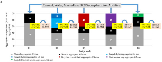 - Second set—Cementitious composite consisting of cement, natural aggregates partially substituted by recycled glass waste aggregates, superplasticiser additive, and water, as shown in Figure 2, without the addition of TiO2 nanoparticles (R2-0NT) and with the addition of 3% TiO2 nanoparticles (weight relative to the amount of cement) (R2-3NT).