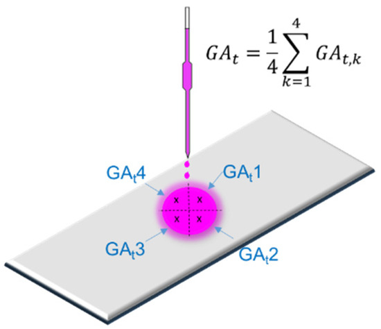 Subsequently, 0.15 mL of a 1 g/L Rhodamine B solution was applied dropwise to the sample surfaces. The degree of whiteness in the stained area was then measured again and reported as the arithmetic mean of four values, one from each quadrant of the stain, as shown in Figure 3.