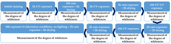 Following the staining process, the samples were subjected to a test cycle consisting of successive phases of UV exposure, washing under artificial rain, and drying, as shown in Figure 4.