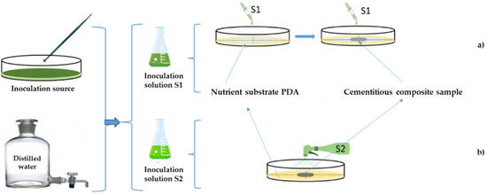 Figure 5. Schematic representation of the working principle for assessing resistance to mould attack: (a) application of concentrated contaminating solution by dripping; (b) application of diluted contaminant solution by spraying. - For the S2 inoculant, a batch was prepared by spraying 0.5 mL of the S2 inoculant directly onto the surface of the cement composite sample already placed on the nutrient substrate (Figure 5b). The spraying was performed centrally, perpendicular to the surface and from a constant height of 50 mm, ensuring that the inoculation solutions were distributed both on the surface of the sample and on the uncovered surface of the nutrient substrate. Consequently, in comparison to the concentrated solution (S1), the degree of contamination in this case would theoretically be reduced by a factor of 60 (1/6 of the amount used in the droplet application multiplied by a factor of 10 dilution).