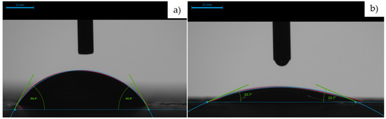 Screenshot image (Speed Camera–DSA100, KRUSS, Germany) at the moment of initial contact between the liquid droplet and the surface of the sample to be analysed: (a) R1-0NT; (b) R1-3NT.