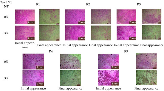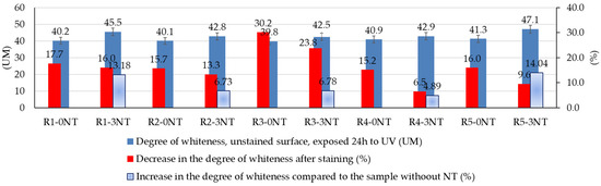 However, it can be assumed that the nature of the aggregates is likely to have an indirect effect on the performance of the composites. This conclusion is supported by the observation that aggregates which contribute to a reduction in the water absorption of the composite—whether due to the inherent properties of the aggregate, as is the case with recycled glass aggregates (RGA), or by promoting reduced porosity, as is the case with slag aggregates (GBA) [59,60]—exhibit less whiteness loss after the staining process. Thus, immediately after staining with a constant amount of staining agent, there was a reduction in the degree of whiteness of 15.7% (R2-0NT)/13.3% (R2-3NT) in the case of RGA or 15.2% (R4-0NT)/6.5% (R4-3NT) in the case of GBA, as shown in Figure 8. On the other hand, brick aggregates, which by nature have a higher water absorption, led to a greater reduction in the degree of whiteness of the composite, namely, by 30.2% (R3-0NT)/23.8% (R3-3NT). The reduction in the degree of staining for the R1 composition, which contains only natural aggregates (with varying amounts of TiO2 nanoparticles added), fell within intermediate values, namely, 17.7% (R1-0NT)/16% (R1-3NT). This observation suggests that the inherent properties of the materials used to prepare the composites exert a nuanced but discernible influence on the resulting microstructure. This in turn manifests itself in varying degrees of surface staining. The particular case of composites incorporating textolite is noteworthy and warrants further investigation. In spite of the fact that the inclusion of RTA induces remarkable structural changes at the microstructural level and shows an increased water absorption within the composite [59,60], from the point of view of the reduction of whiteness after staining, values closer to those of composites with reduced water absorption were recorded: 16% (R5-0NT)/9.6% (R5-3NT), as shown in Figure 8. This behaviour may indicate that not only the water absorption and porosity of the composite influence its interaction with the staining agent, but also the specific properties of the materials involved. In this case, given that RTA is originally a plastic material, it is highly likely that the staining agent has reduced adhesion to this waste material, resulting in minimised staining due to Rhodamine B retention.