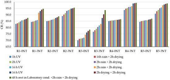 For this study, the experimental results showing the evolution of the degree of whiteness of the cementitious composite surfaces stained with Rhodamine B solution are shown in Figure 8, while the capacity for whiteness recovery is shown in Figure 9.