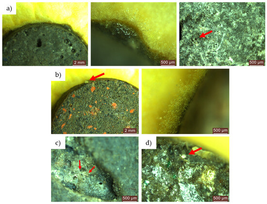 3.3.3. Microscopic Analysis of the Specimen Surfaces after 120 Days (4 Months) of Exposure to the Contaminated Environment