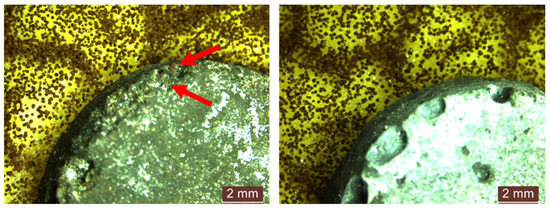 The prepared and sealed test systems were placed under laboratory conditions of (23 ± 2) °C, (65 ± 5)% relative humidity, and natural lighting. At predetermined time intervals (24 h, 48 h, 72 h, 30 days, and 120 days—4 months after exposure of the sample in the contaminated system), the samples were examined both visually and microscopically for any signs of growth or development of biological material. The presence and development of the inhibition halo was monitored, and its diameter (D) was recorded as the average of at least four measurements.