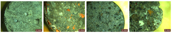 Microscopic analysis shows that the incorporation of TiO2 nanoparticles (NT) into the composition imparts a biocidal capacity to the surface of the material. This capacity is influenced by the NT concentration and the type of aggregates used. Under constant conditions, including mould type, inoculant type and amount, and exposure time, certain recycled waste aggregates were found to promote mould growth, particularly in the case of textolite (R5). Conversely, other aggregates, such as those derived from brick and slag (R3 and R4), inhibit mould growth compared to the control sample R1.