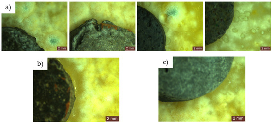 - partial biocide effect—the sample present mould marks or weak contamination; the halo is partial visible around the cementitious samples, and they have an irregular shape;