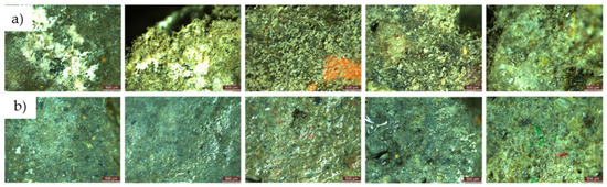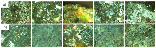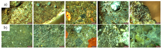 Figure 23. Microscopic analysis of cementitious composite samples after 4 months of exposure to a diluted solution (S2) of Penicillium chrysogenum to a contaminated environment—from left to right, the control composition with natural aggregates (R1), the composition with recycled glass aggregate (R2), the composition with recycled brick aggregate (R3), the composition with glass aggregate (R4), the composition with textolite (R5): (a) compositions without NT; (b) compositions with NT.