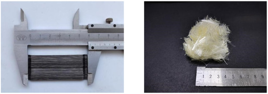In this experiment, the following raw materials were used, each with their respective parameters and properties. P.O42.5 cement served as the cement type. The coarse aggregate comprised crushed stones ranging from 5 mm to 40 mm, with small stones (5 mm–20 mm) accounting for 55% and large stones (20 mm–40 mm) accounting for 45%. The fine aggregate (fineness modulus is 2.63) was obtained from natural river sand and continuous grading. Sand and gravel provided by Nanjing Convergence Stone Co., Ltd. (Nanjing, China). Three-dimensional hooked-end steel fibers with a length of 60 mm were used as the steel fibers, as depicted in Figure 1. Steel fibers utilized were supplied by Yutian Zhitai Steel Fiber Manufacturing Co., Ltd. (Tangshan, China). The PVA fibers utilized were supplied by Kuraray Co., Ltd. (Tokyo, Japan), with a diameter of 31 μm and a length of 12 mm, as shown in Table 1 and Figure 1. A high-efficiency polycarboxylate-based water-reducing agent was employed. High-quality Class I fly ash was utilized. The experiment employed tap water sourced from the local supply.