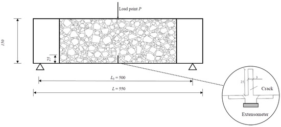 Following the standard BS EN 14651:2005+A1:2007 [44], a total of 54 beams measuring 150 mm × 150 mm × 550 mm were cast for the three-point bending test. After 24 h, they were demolded and subsequently cured for 28 days in a standard curing chamber (RH > 95%, temperature is 20 ± 2 °C). To measure the CMOD, an extensometer was installed at the notch position, as depicted in Figure 2. The three-point bending test was performed according to the European standard, utilizing a displacement rate of 0.05 mm/min (for displacements from 0 to 0.1 mm) and 0.2 mm/min (for displacements from 0.1 to 3.5 mm). The DIC technique was utilized to capture the failure mode of the specimens during loading, as shown in Figure 3. Crack formation and extension during the three-point bending tests of concrete were observed. If any specimen did not exhibit cracking from the pre-cut notch, the test result was excluded. The , , and values of the concrete were calculated using Equations (1)–(3), respectively.