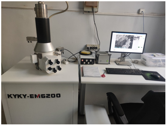 The KYKY-EM6200 scanning electron microscope, depicted in Figure 4, was utilized in this experiment. It offers a magnification range of 6×–100,000×, with a secondary electron imaging resolution of 3 nm at an applied voltage of 30 kV and 10 nm at an applied voltage of 3 kV. The preparation of specimens took place after the completion of the three-point bending test.
