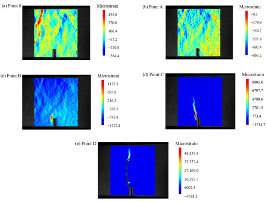 From Figure 5 and Figure 6, it can be observed that during the pre-peak stage (before point C in Figure 5), no macroscopic cracks were formed. The strain distribution was uniform before point A, and stress concentration started to occur at the pre-existing crack location (point B), resulting in relatively small strain values. At this point, the F was 4.5 kN. As the F increased to 8.94 kN, the peak F of the reference concrete was reached, and the strain values reached their maximum. After point C, with a further increase in , the reference concrete rapidly developed cracks, and the F dropped sharply. The first crack was observed (point D), almost the entire height of the sample.