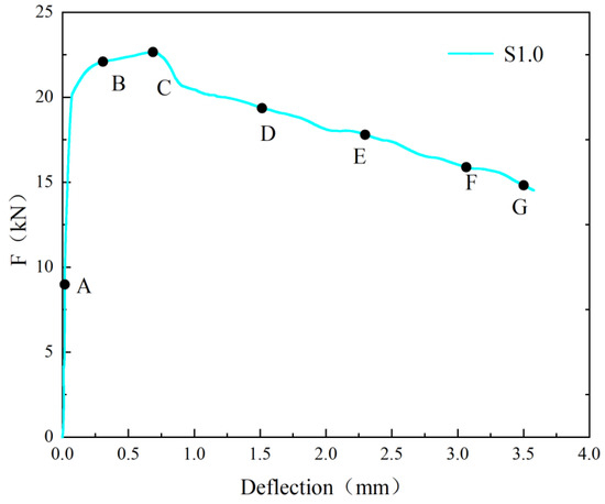 To clearly illustrate the propagation of cracks in the SFRC during the test, Figure 7 presents the F-δ curve of S1.0, and Figure 8 shows the DIC measurement values at various stages.