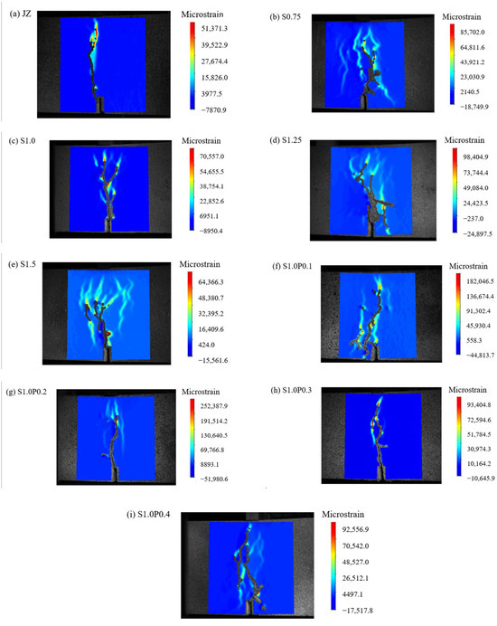 When the is 3 mm, the DIC measurements for plain concrete, SFRC, and S-PVA HFRC are shown in Figure 9.
